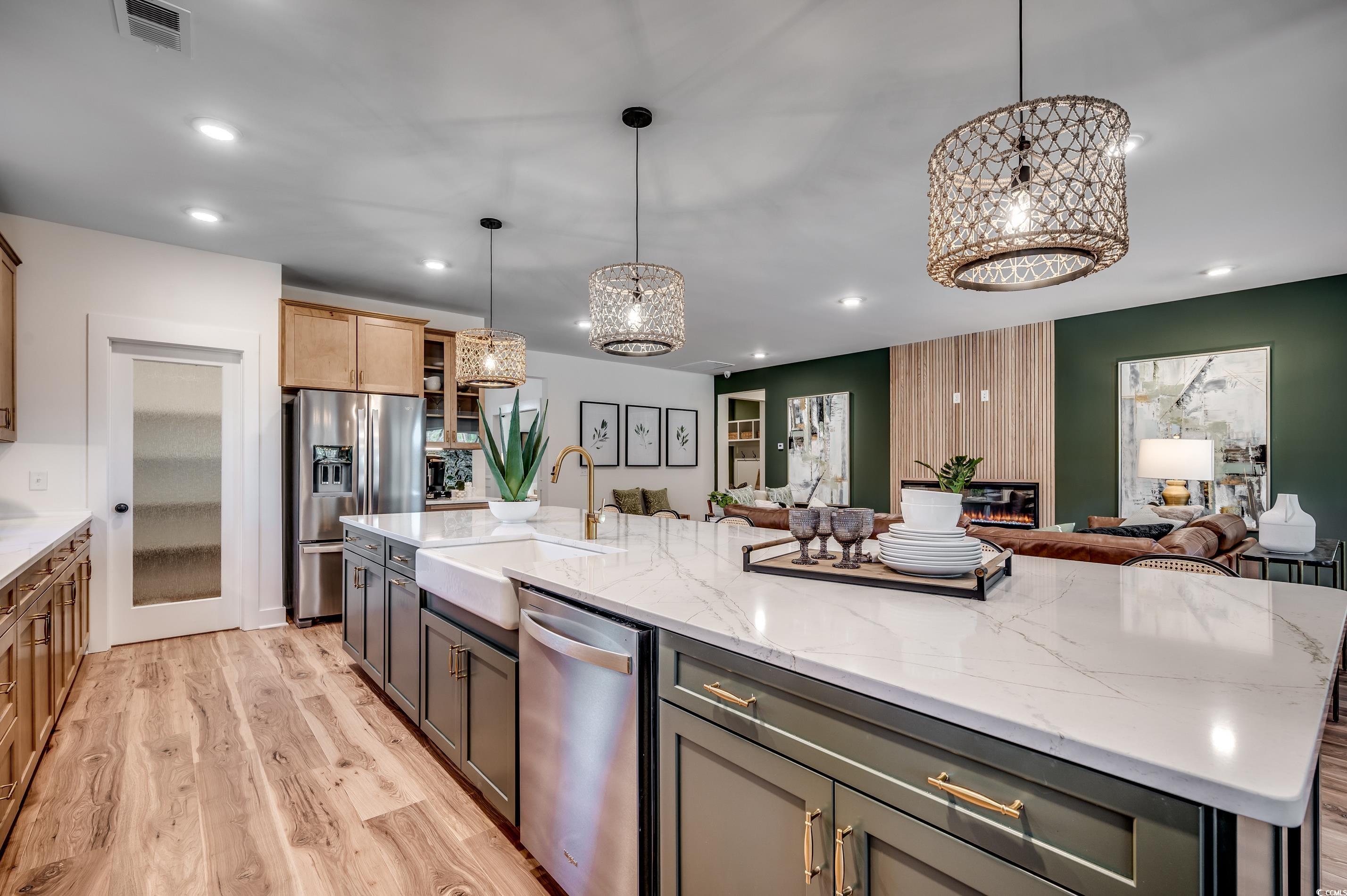 Welcome to the Sterling, a thoughtfully designed single level home in the heart of old Murrells Inlet. This versatile plan includes 3 bedrooms, 3 bathrooms, a private study with French doors, and a golf cart garage for added convenience. The true centerpiece of this home is the open-concept kitchen, great room, and dining area that wraps around a show-stopping 13-foot kitchen island. Abundant counter space and a walk-in pantry create a layout built for entertaining; this kitchen is as functional as it is impressive. Bedroom 3 is tucked away from the main living areas and includes its own private full bath. The spacious primary suite offers a huge walk-in closet and a spa-inspired en-suite, with a 5-foot walk-in tile shower with glass enclosure, dry-off seat, Moen rain and wall shower heads. This Sterling boasts a Carolina room in lieu of the covered porch which increases the living space and adds a charming view of the wooded backyard. The upgraded Gourmet kitchen includes Level 4 Quartz countertops, a Kohler cast iron sink, Whirlpool wall oven/wall microwave, exhaust hood, under cabinet lights, soft close cabinet doors and drawers, a KitchenAid Induction cooktop, and the huge faux cabinet-wrapped kitchen island. Upgrades galore with Sunbathed Pecan REV Wood laminate throughout the living areas and bedrooms, DalTile 18x18 tile in all baths and laundry room, a lawn irrigation system, black door hardware, Progress Light fixtures, Moen plumbing fixtures, and a fireplace. Step outside to enjoy the natural beauty of the .46-acre homesite, perfect for relaxing evenings or entertaining guests. Located in the sought-after Northbrook community, this home offers quiet solitude away from the hustle and bustle with easy access to Brookgreen Gardens, Huntington Beach State Park, minutes to 2 public boat launches, and 1 mile to the Murrells Inlet waterfront, combining convenience with comfort. As Americas number one energy-efficient homebuilder, were proud that in 2024 our homes achieved an average net HERS score of 37 (with solar) and a gross score of 42the lowest publicly reported among the top 30 U.S. homebuilders in Builder Magazines Top 100 list (ranked by 2024 closings). Contact us today to learn more about exclusive buyer incentives. Anticipated completion date, March. DISCLOSURE: Photos are of the decorated model home. Similar color choices were selected for this home.