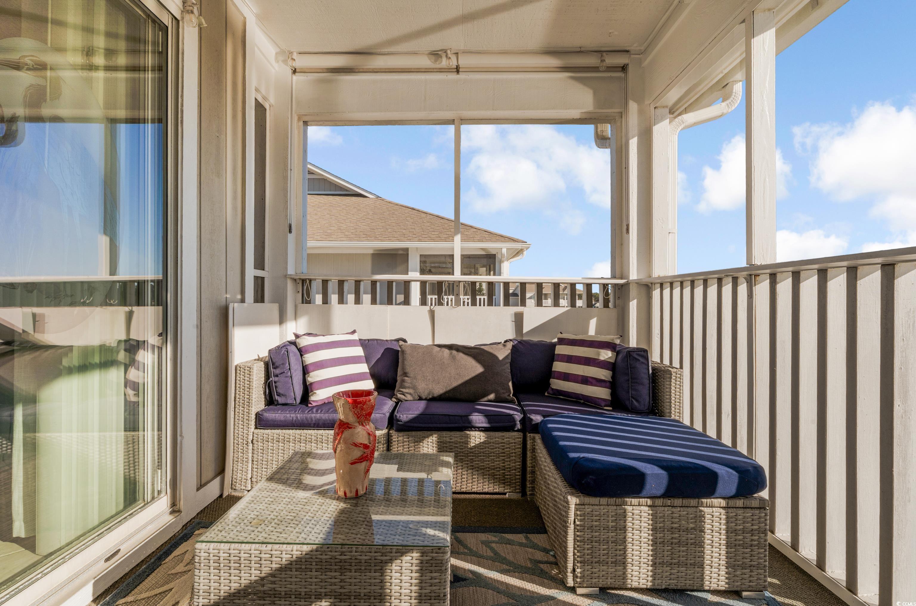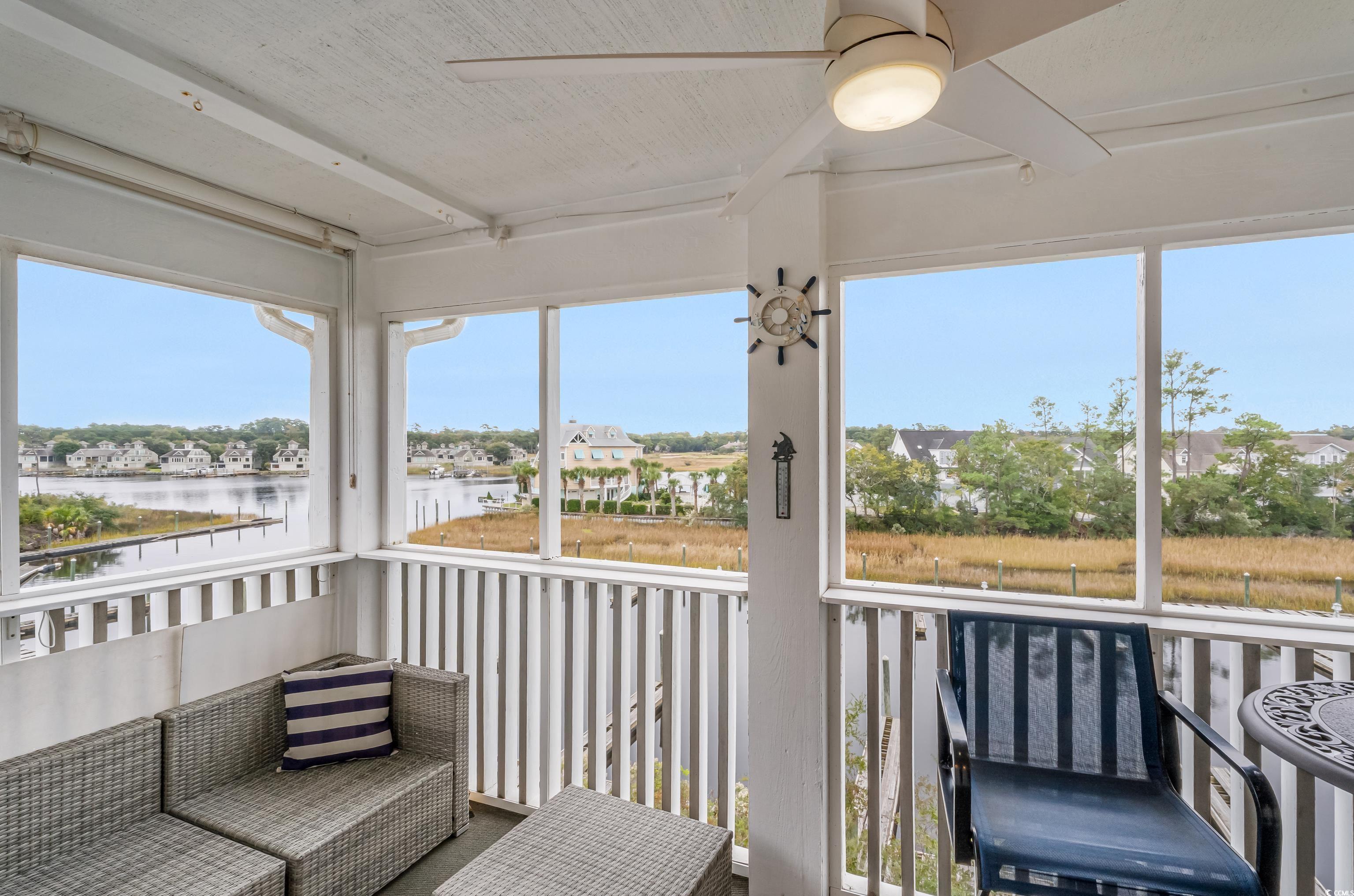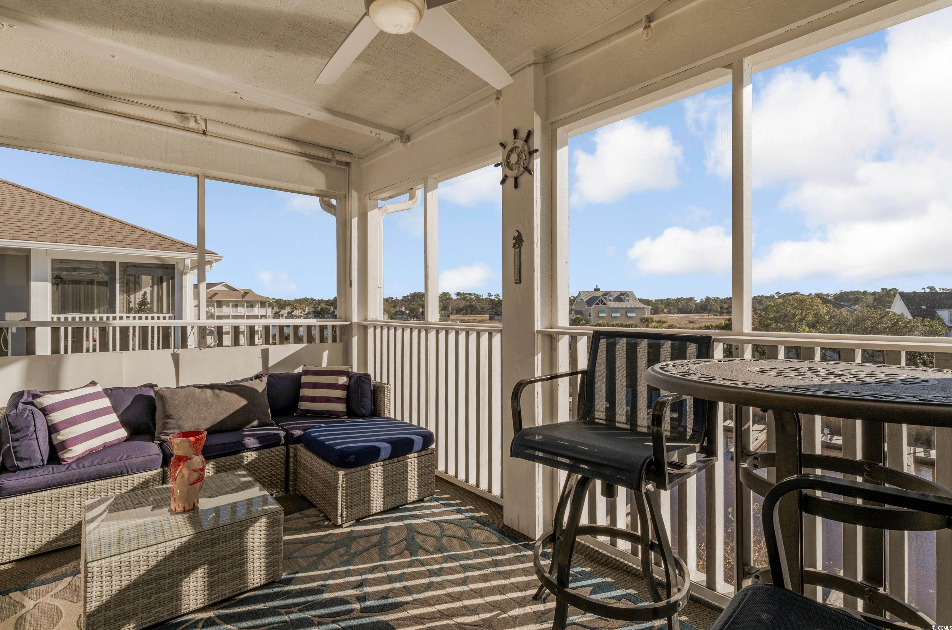 Step inside and youll immediately feel the difference of a top-floor, end-unitits brighter, more open, and more private. The main living space features vaulted ceilings and modern lighting that gives the home an airy, coastal feel. The kitchen is clean and updated in style, with gray cabinetry, white solid-surface counters, a classic tile backsplash, and a large breakfast bar thats perfect for quick meals, hosting friends, or setting out snacks after a day on the water. The layout flows easily into the living and dining areas, and the best part is how the home connects to the outdoors. Slide the doors open from the living room or the primary bedroom and head to the screened-in porch, a true bonus living space with a ceiling fan and room for both lounging and dining. Both bedrooms are comfortably sized and the bathrooms are bright and functional with clean finishes and updated touches. If youve been searching for a 2 bed 2 bath top-floor condo in Little River with a waterway view near North Myrtle Beach, this one checks the boxes: light, open, move-in ready, and made for easy coastal living.