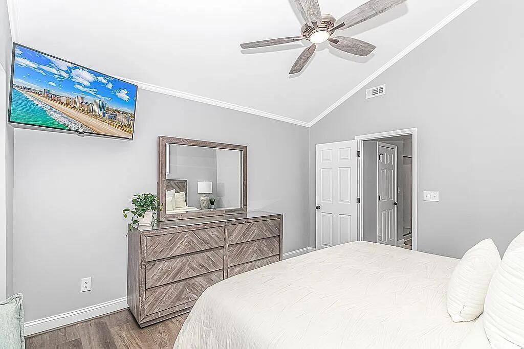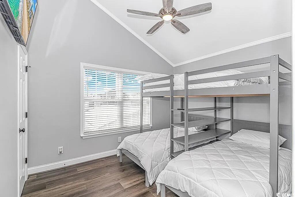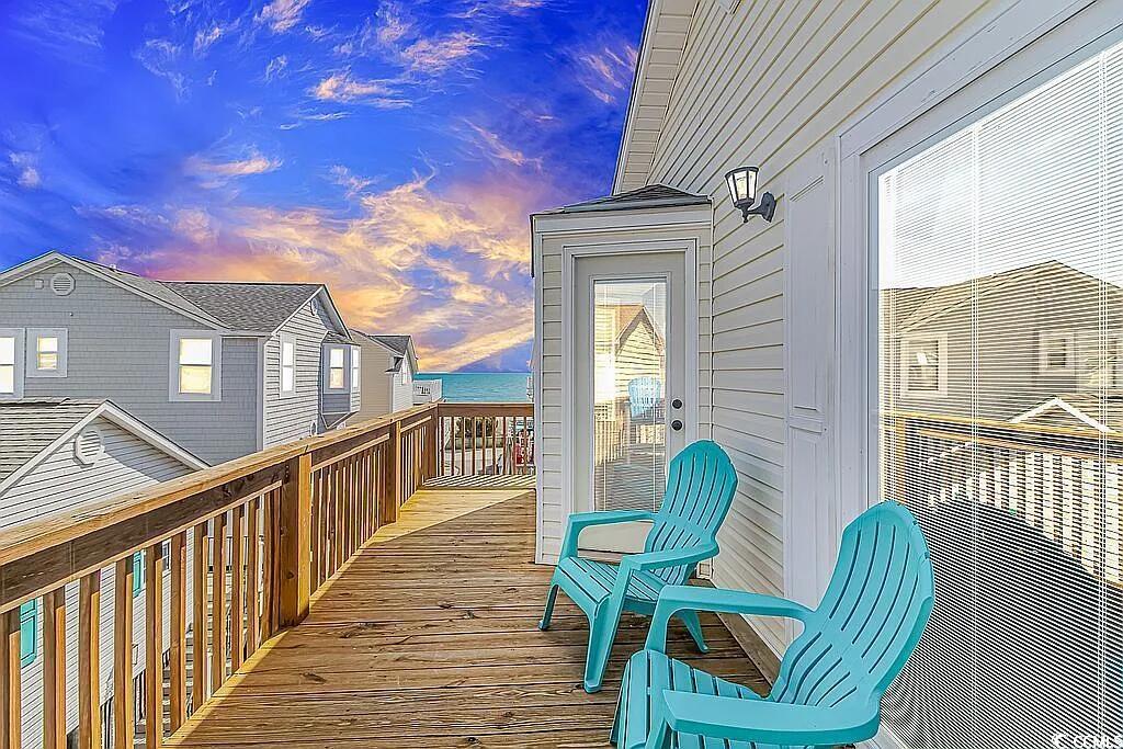 A turnkey, fully renovated beach house awaits at 1098, located within the acclaimed Ocean Lakes Family Campground. This 4-bedroom, 3-bath, two-story raised beach house comes fully furnished and delivers breathtaking views of the Atlantic Ocean from all three porches. Recent improvements include two new HVAC units installed in 2024, a new hot water heater added in 2025, and new exterior gutters installed in 2024. Positioned just five houses from the ocean, the main floor features a spacious living room that flows into an open-concept dining area and kitchen with a charming breakfast bar. The kitchen includes brand-new custom all-wood cabinet doors, top-tier stainless steel appliances (washer and dryer included), and granite countertops. The home showcases new LVP flooring throughout and tile flooring in all three bathrooms. The first floor includes a bedroom and full bath with a new vanity, tile shower, and toilet. Upstairs are three additional bedrooms. The primary and second bedrooms feature new solid-wood High Point Furniture Market sample king bedroom sets. The third bedroom includes a full-over-twin bunk bed. Two additional full bathrooms include new vanities, toilets, and tub/shower units. Enjoy exceptional ocean views from all three decks, generous parking under the home, and a convenient outdoor shower. A full renovation completed in November 2023 added crown molding, custom window casings throughout, and a custom amethyst stone tile fireplace with an electric heater insert
