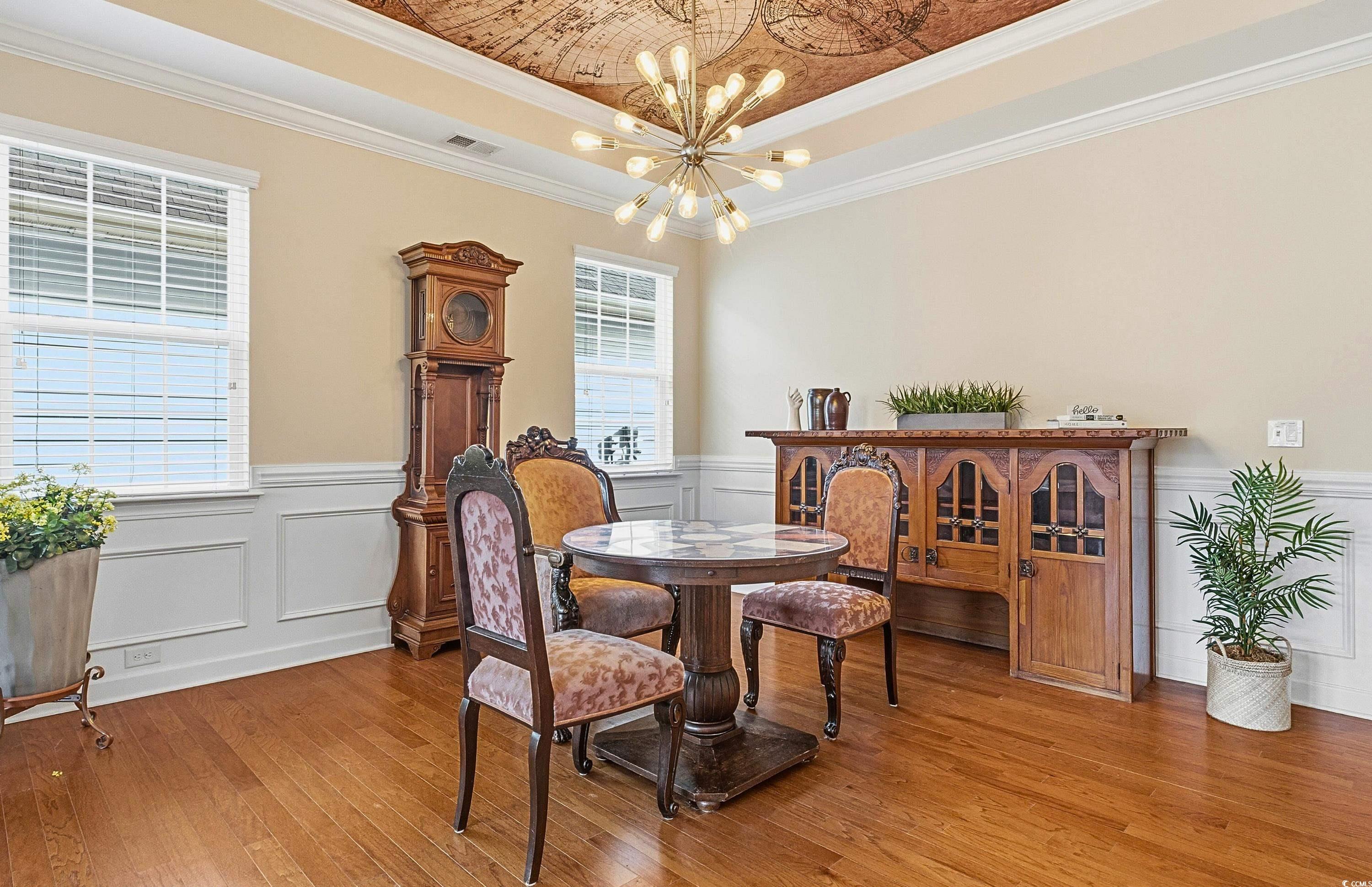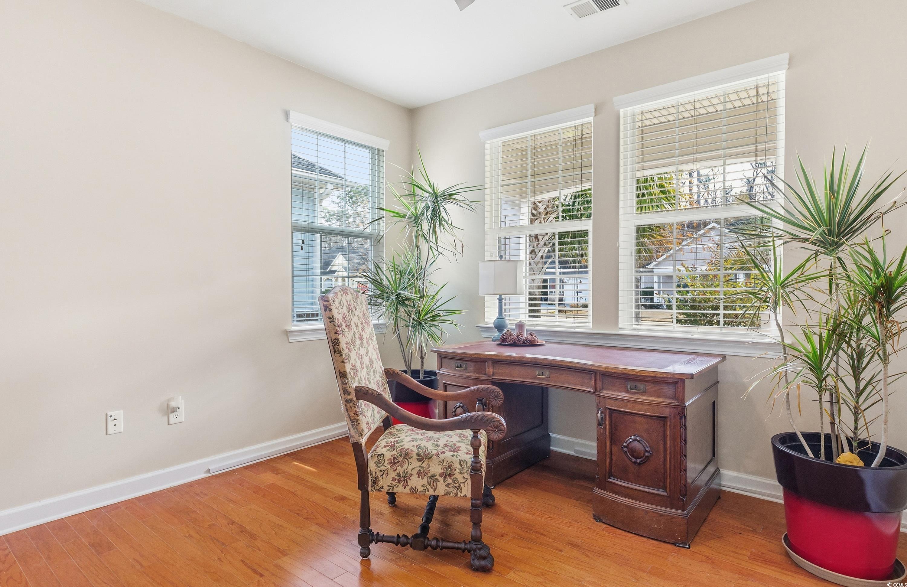 A truly stunning home located in the highly sought-after Monarch section of Emmens Preserve, where thoughtful upgrades, comfort, and waterfront living come together seamlessly. This beautifully maintained 4-bedroom, 3-bath Parris Model offers an open floor plan filled with natural light and immediate wow-factor, highlighted by serene private water views visible from nearly every window in the main living spaces. The heart of the home is the expansive family room and kitchen, featuring cathedral ceilings, a gas fireplace with custom shiplap accents, and walls of windows overlooking the water. The kitchen is thoughtfully appointed with 42"" raised-panel maple cabinetry, granite countertops, stainless steel appliances, custom tile backsplash, and brushed nickel lighting and hardware, including a gas GE range and dishwasher. Hardwood flooring extends throughout the foyer, dining room, kitchen, family room, and into the bedrooms and primary closet, creating warmth and continuity throughout. The formal dining room is enhanced with tray ceilings, crown molding, and wainscoting, while updated lighting and smart Lutron Caseta WiFi switches add modern convenience. The primary suite offers a peaceful retreat with a tray ceiling, ceiling fan, private access to the patio, and a well-appointed ensuite bath with double granite vanities, garden tub, separate shower, and oversized walk-in closet. Outdoor living is exceptional, with an enclosed lanai featuring a gas connection, extended patio, fenced backyard, and mature palm-tree landscaping overlooking the private pond. A 240V hot tub line is already in place, creating endless possibilities for a resort-style backyard experience. Behind the scenes, this home shines with major system upgrades, including a replaced HVAC condenser, HVAC duct cleaning (2020 & 2023), re-applied attic insulation, solar attic vent fan, electric panel surge protection, generator interlock, and arc-fault breakers, all providing peace of mind and improved efficiency. The finished two-car garage includes overhead storage racks, a ladder stairway to the attic, and a Carrier Comfort mini-split system, making it ideal for projects, storage, or hobbies. Recent improvements continue with hurricane shutters, refreshed landscaping, updated bathroom flooring throughout, a fully remodeled third bathroom, replaced exhaust fans, all-new LED recessed lighting, and fresh interior and exterior paint in 2025. Residents of Emmens Preserve enjoy a state-of-the-art pool, fitness center, clubhouse, and 29 acres of parks, lakes, and walking trails, including the beloved Emmens Park with outdoor kitchens, fire pits, putting greens, bocce ball courts, horseshoe pits, and moreplus a nearby pooch park. Ideally located just minutes from The Market Common and close to Myrtle Beach State Park, offering over a mile of pristine beaches, this home delivers exceptional lifestyle, location, and luxury!