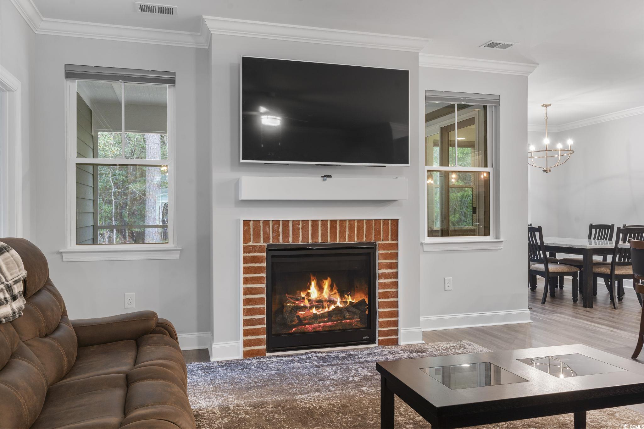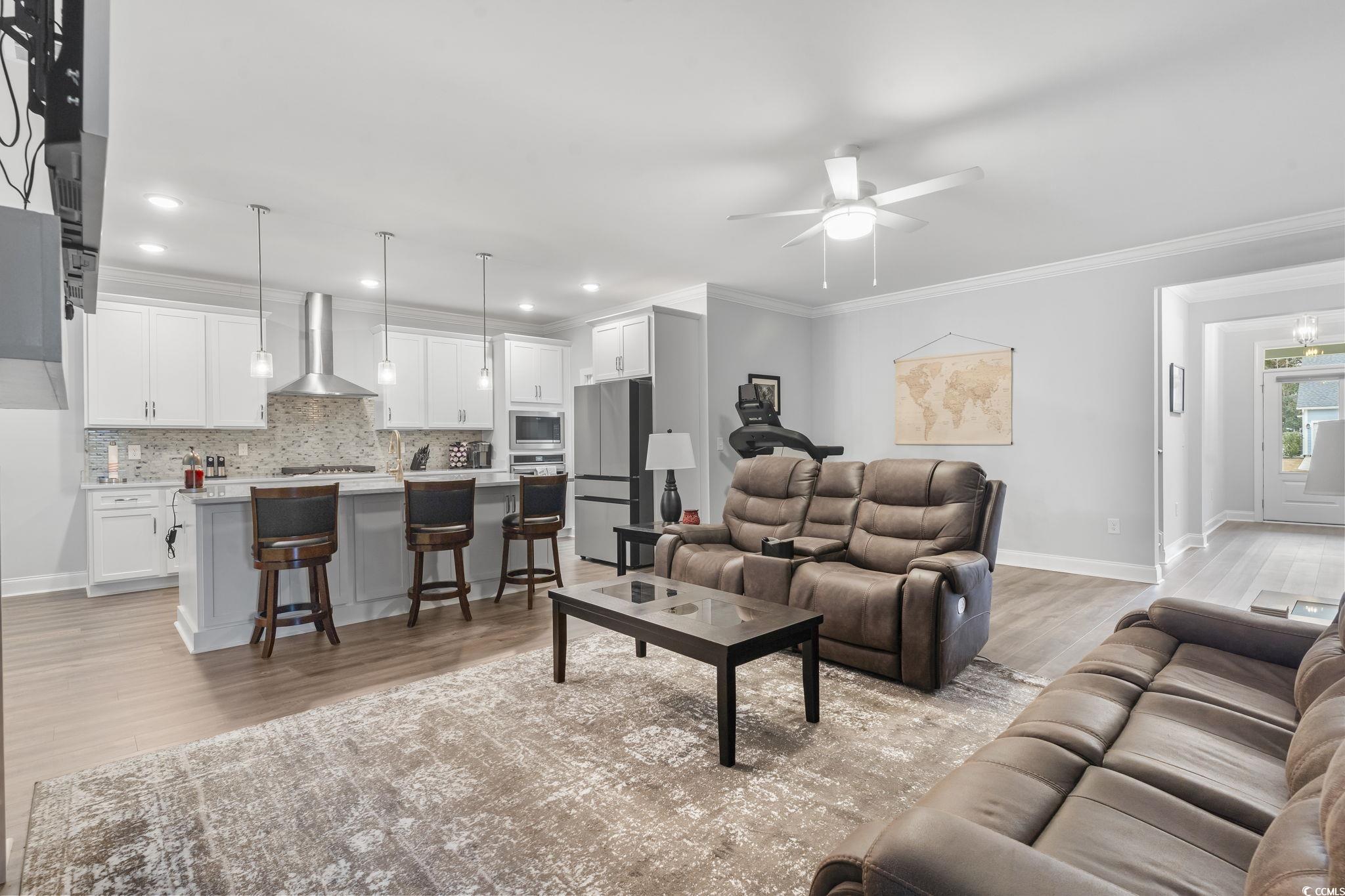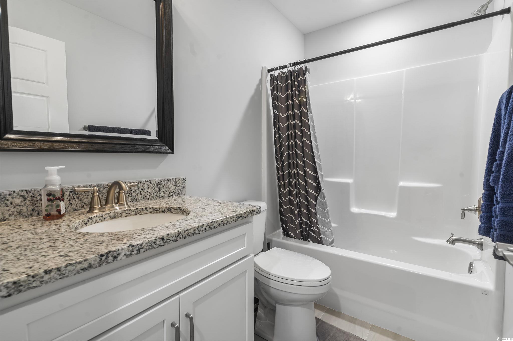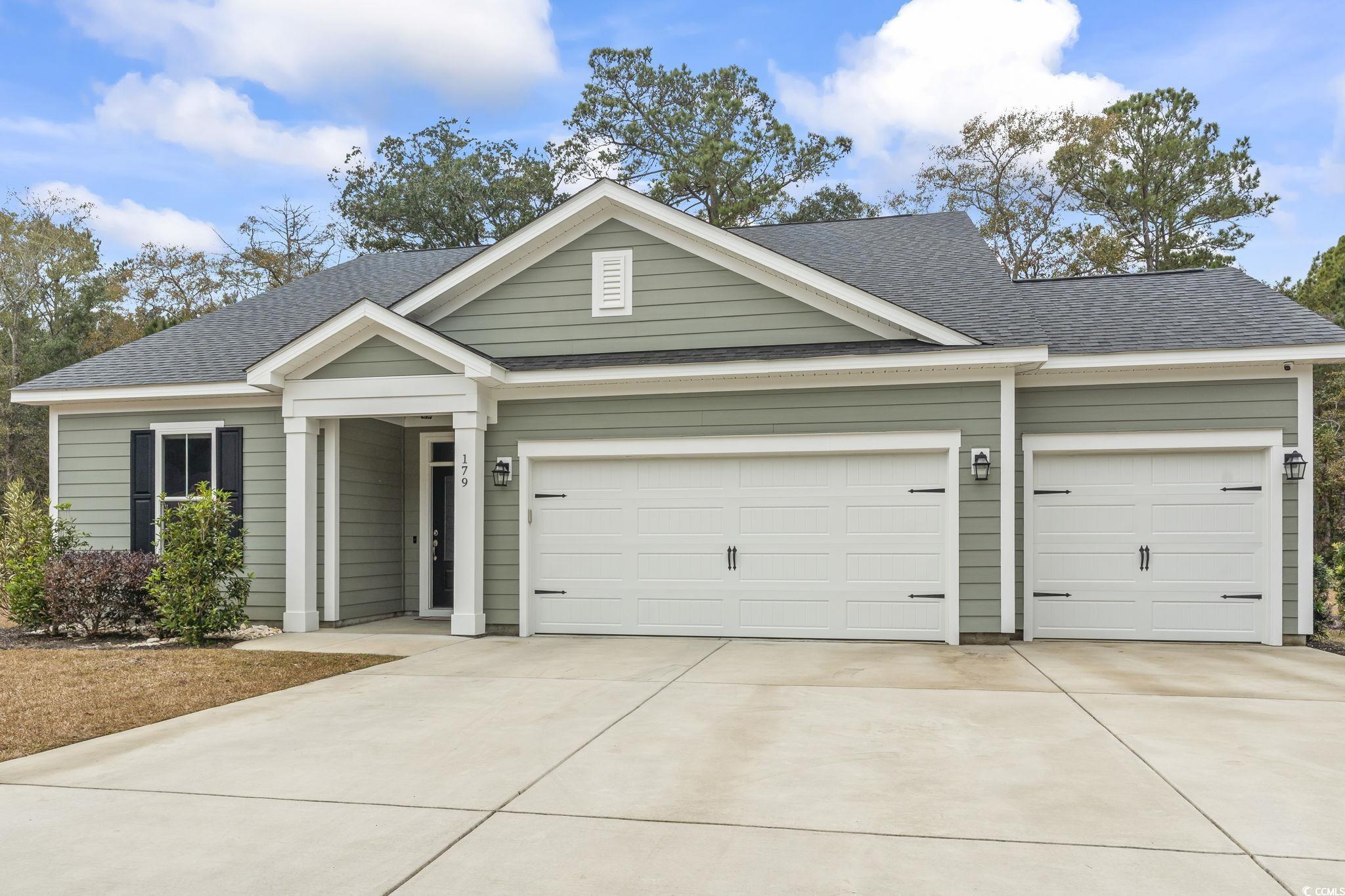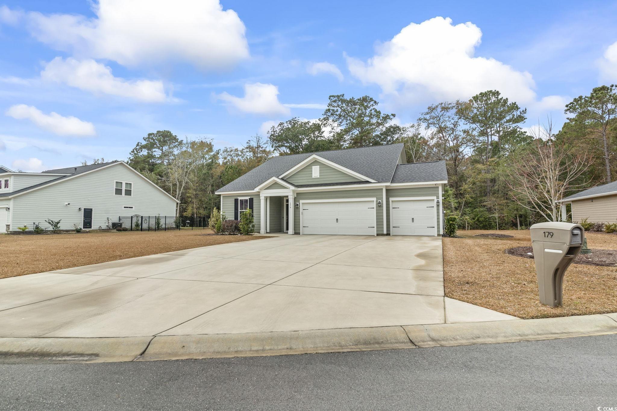 Located in Caroline Court, a boutique community of just 20 homesites, this thoughtfully designed home offers a rare 3-car garage, 4 bedrooms, 3 full baths, and a spacious bonus room, all in a highly desirable and quiet part Murrells Inlet. An extra large driveway and welcoming front porch leads into an open-concept layout designed for comfortable everyday living and easy entertaining. Luxury vinyl plank flooring runs throughout the main living areas, enhancing both durability and style. The large family room flows seamlessly into the kitchen and overlooks the covered rear porch, creating an ideal protected outdoor space. The kitchen is a true centerpiece, featuring quartz countertops, an 8-foot island, generous cabinetry, and ample workspace; perfect for gathering, cooking, and hosting. The open layout keeps the kitchen connected to the main living area while maintaining functionality. The primary suite, located on the main level, provides a private retreat with a well-appointed ensuite bath featuring dual sinks and an enormous tiled shower. Two additional bedrooms and a full bath on the main level offer flexibility for guests, office space, or hobbies. Upstairs, you'll find an additional bedroom, a full bath, and a large bonus room, ideal for a media room, game room, or flexible living space. The attached 3-car garage is a standout feature, offering room for vehicles plus a golf cart, beach chairs, and storage, making it well suited for coastal living. This home is just moments from the public boat landing at Waccamaw Marina, approximately 5 minutes to the Murrells Inlet Marsh Walk, and a few minutes to Huntington Beach State Park or Garden City Beach. Myrtle Beach and Pawleys Island are each about 20 minutes away, while Charleston is approximately 75 miles south. Schedule your private tour today. Measurements are approximate and to be verified by buyer.