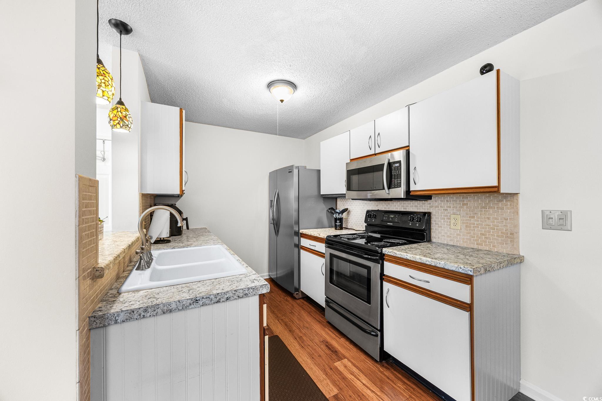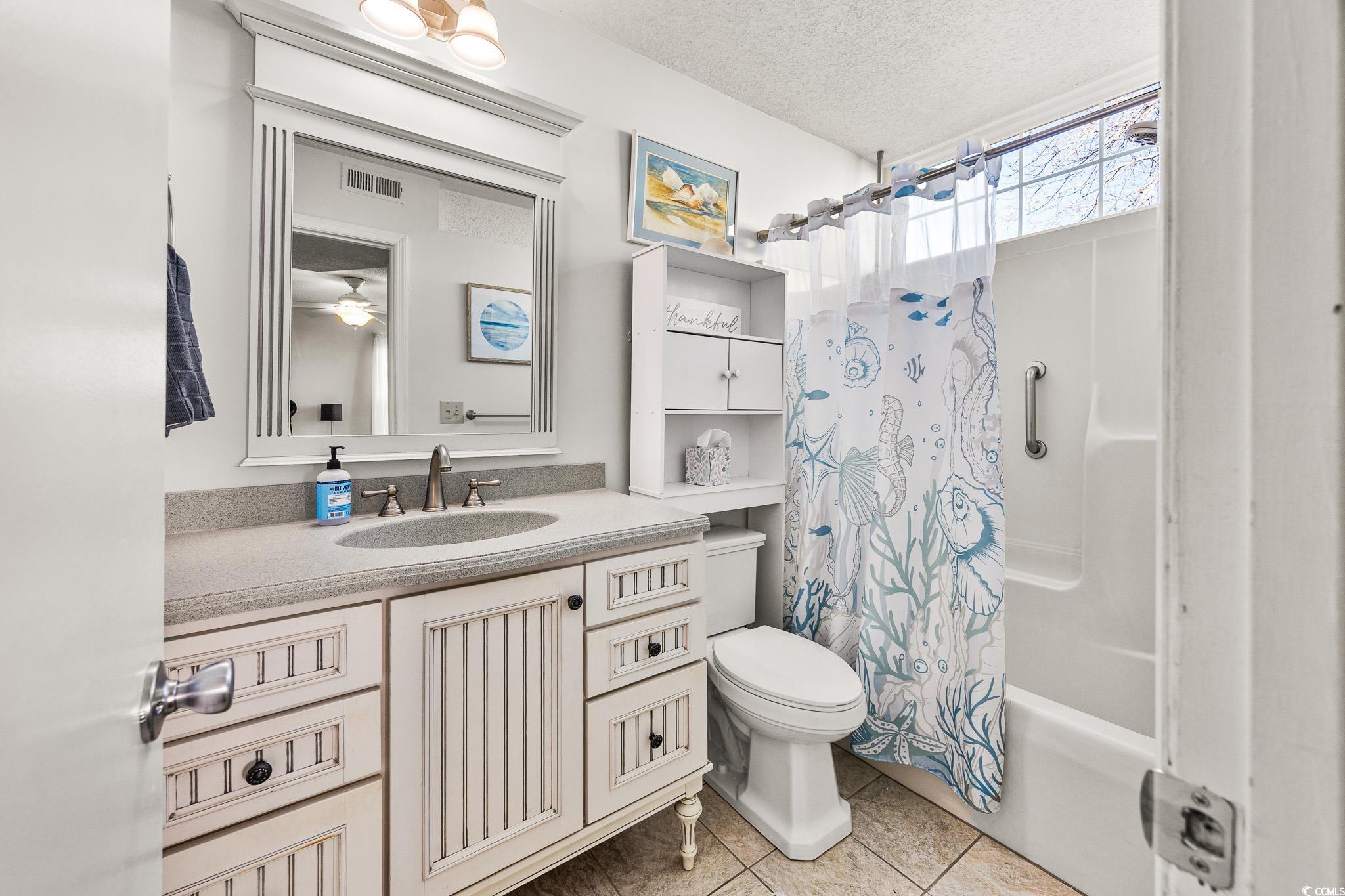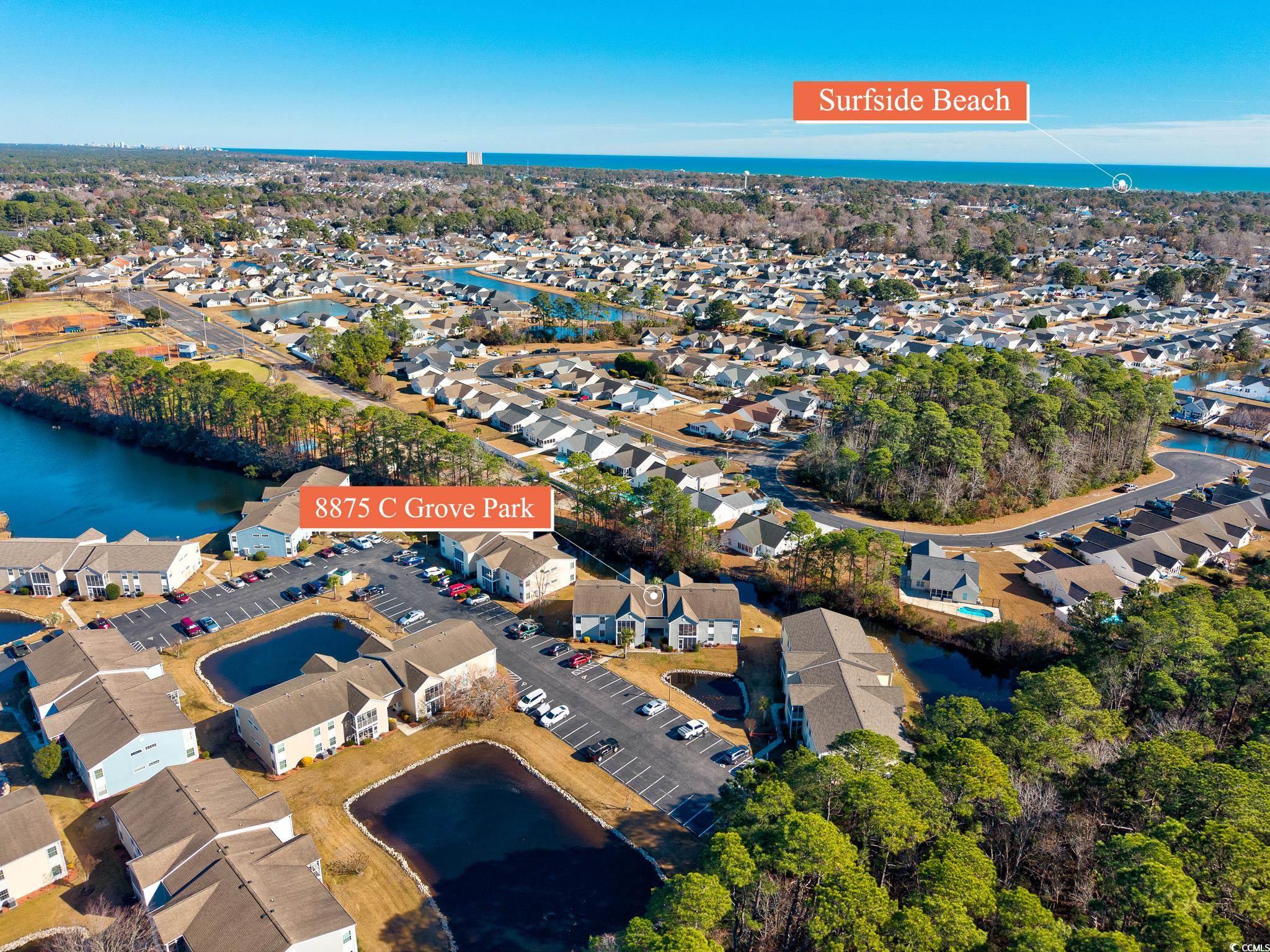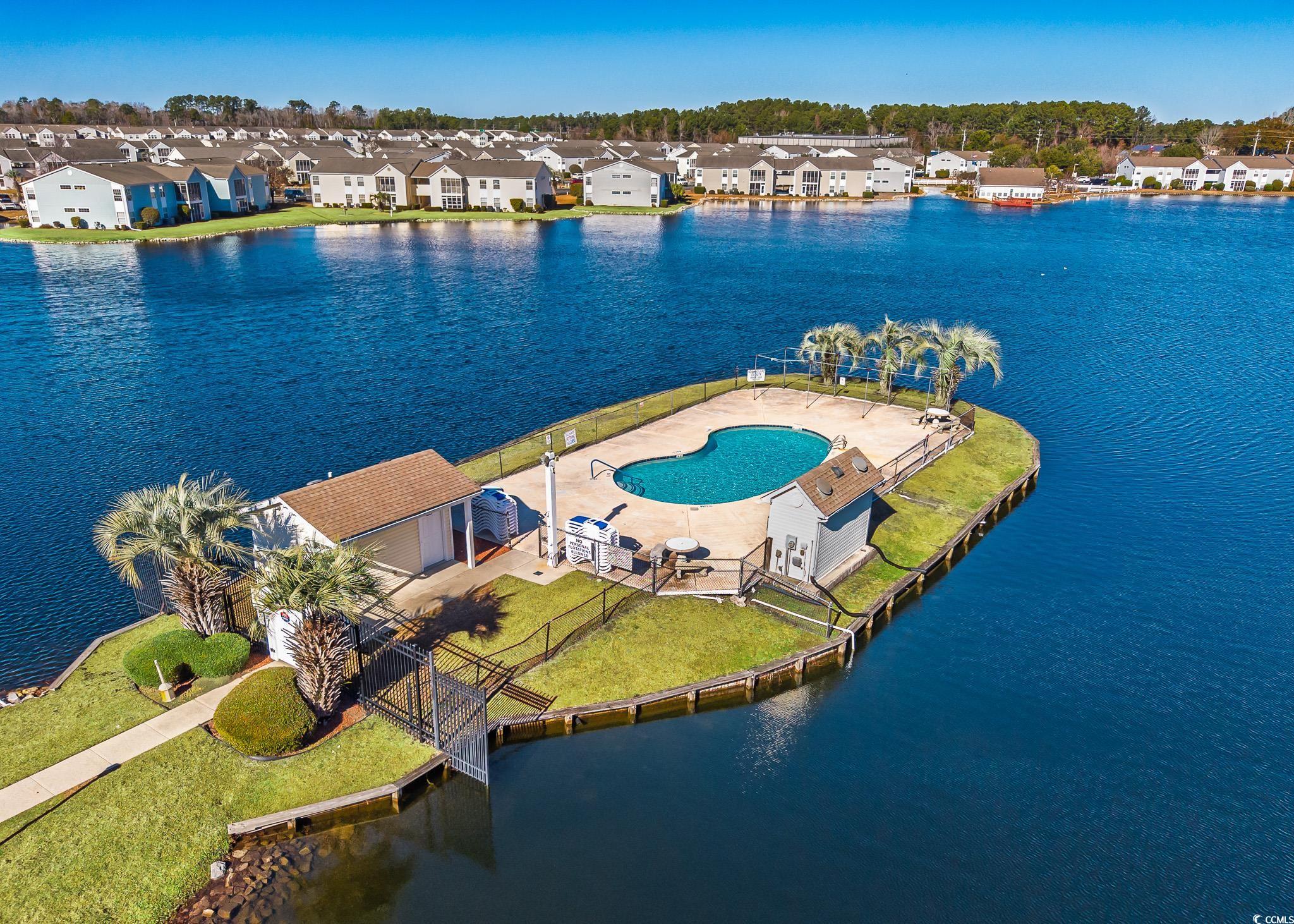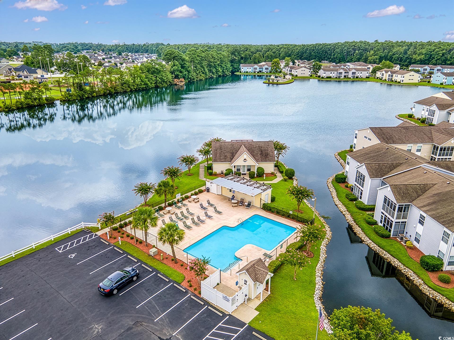 FIRST FLOOR, GROUND LEVEL, with TRANQUIL POND VIEWS from the SCREENED PORCH. Two miles to Surfside Beach city limits, 2 miles to Surfside Pier, and less than one mile to a major grocery store and retail complex. Enjoy two community pools, including the island pool, a clubhouse and well maintained grounds with an observation deck over the main lake. HVAC was replaced in 2024, as well as the sliding doors to the porch, and the home has been freshly painted. The kitchen is fully equipped with a stainless steel fridge and range, dishwasher, double sink, and dinette area. Washer and dryer are included. The screened rear porch features an outside storage room, tile flooring, and a very comfortable space for viewing nature. South Bay Lakes is conveniently located east of 17 Bypass, with easy access to the airport, beach, dining, the famous Murrells Inlet Marsh Walk, Huntington Beach State Park, Brookgreen Gardens and more.