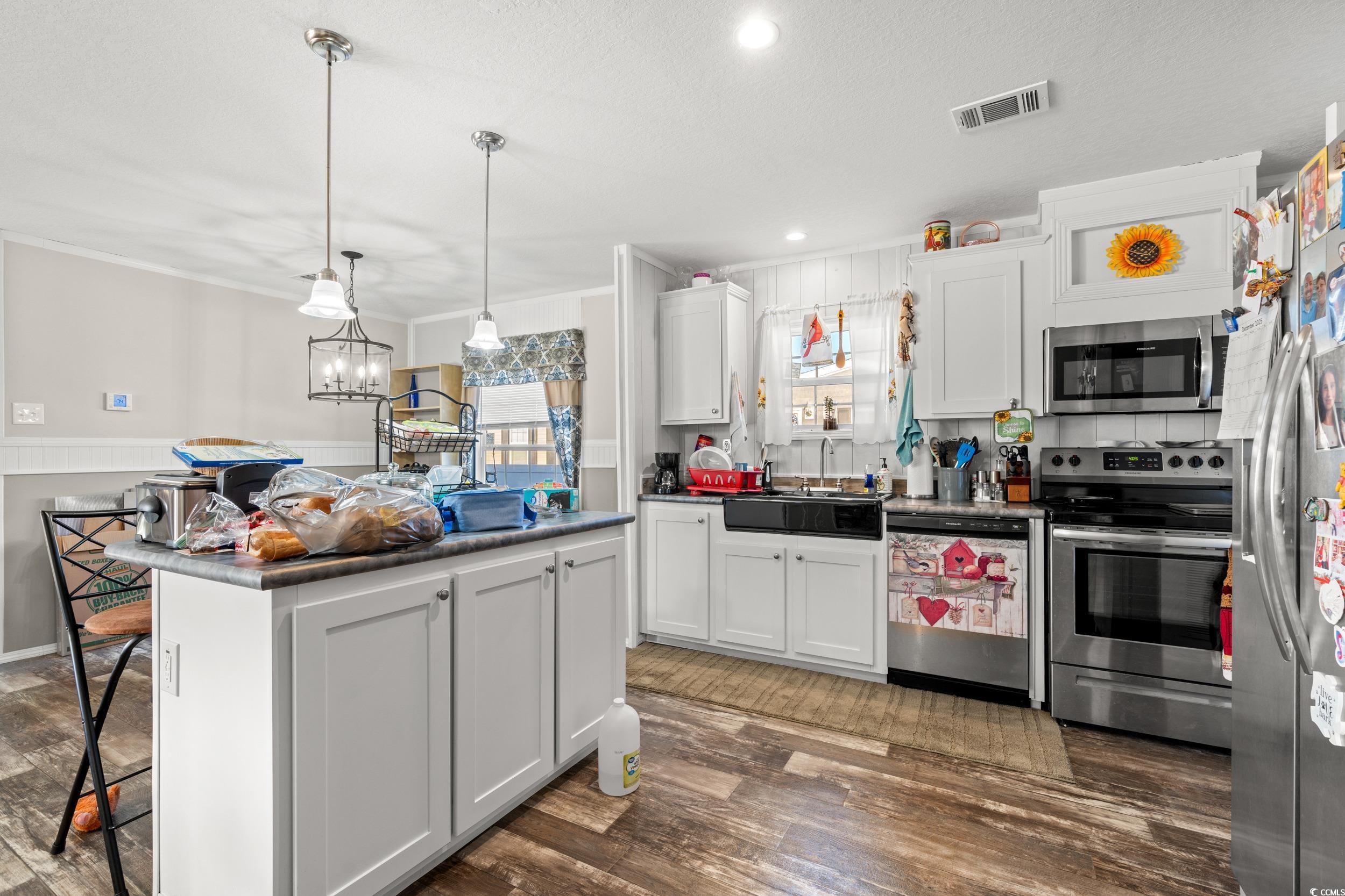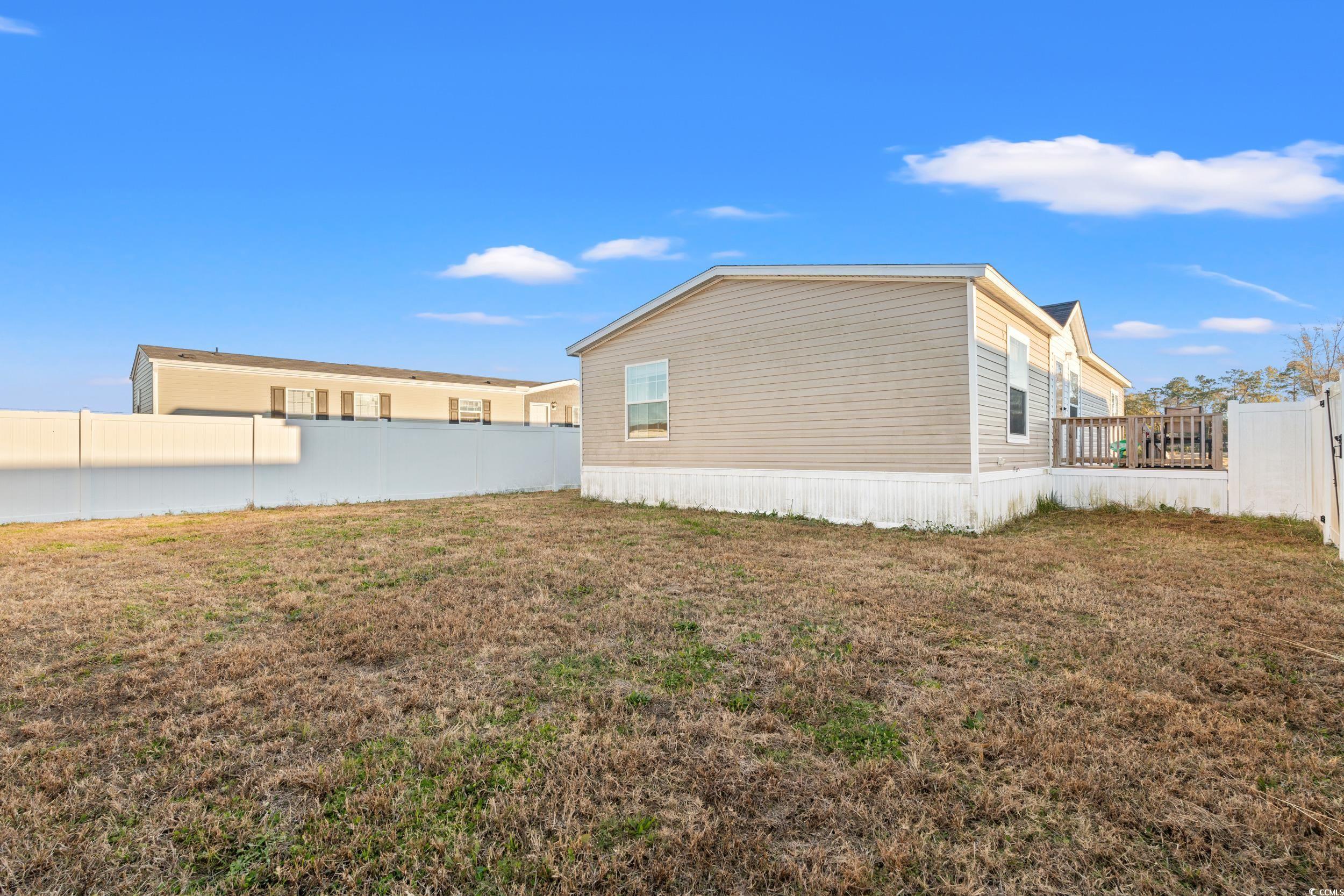 This beautifully appointed and carefully designed 3 bedroom, 2 bath manufactured home is just three years old and maximizes living space with an open and inviting layout. The expansive central living room flows effortlessly into a bright, contemporary kitchen that features a versatile island work station, serving bar, stainless steel appliances, and a walk-in chefs pantry. Tucked away just off the kitchen is the separate laundry area with additional storage. With a split bedroom floor plan, the master bedroom serves as a private retreat, complete with a walk-in closet, en-suite bath featuring dual sinks, a spacious walk-in shower, and a soaking tub. The two additional bedrooms are generously sized and share a well-appointed second bathroom. Crown molding, decorative chair rail, and drywall enhancements are present throughout the home. Exterior features include an extra wide driveway to accommodate more vehicles, a handicap access ramp, a fully enclosed yard with vinyl fencing and a back deck with a cozy sitting area. Conveniently located just minutes away from Joes Diner - a local favorite, Market Common shopping and entertainment, Coastal Grand Mall, Myrtle Beach Airport, and of course the beach!!