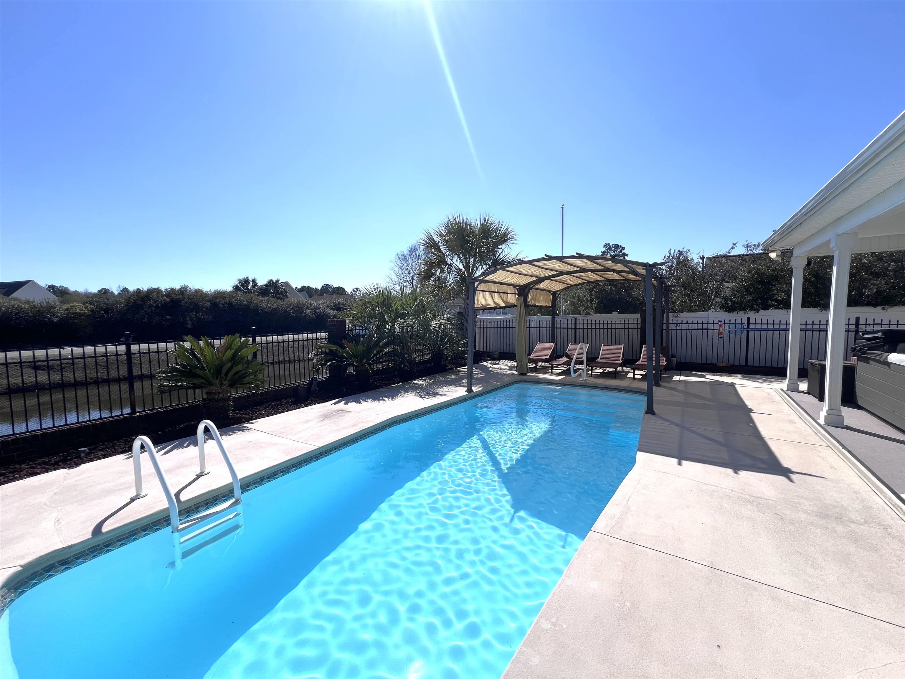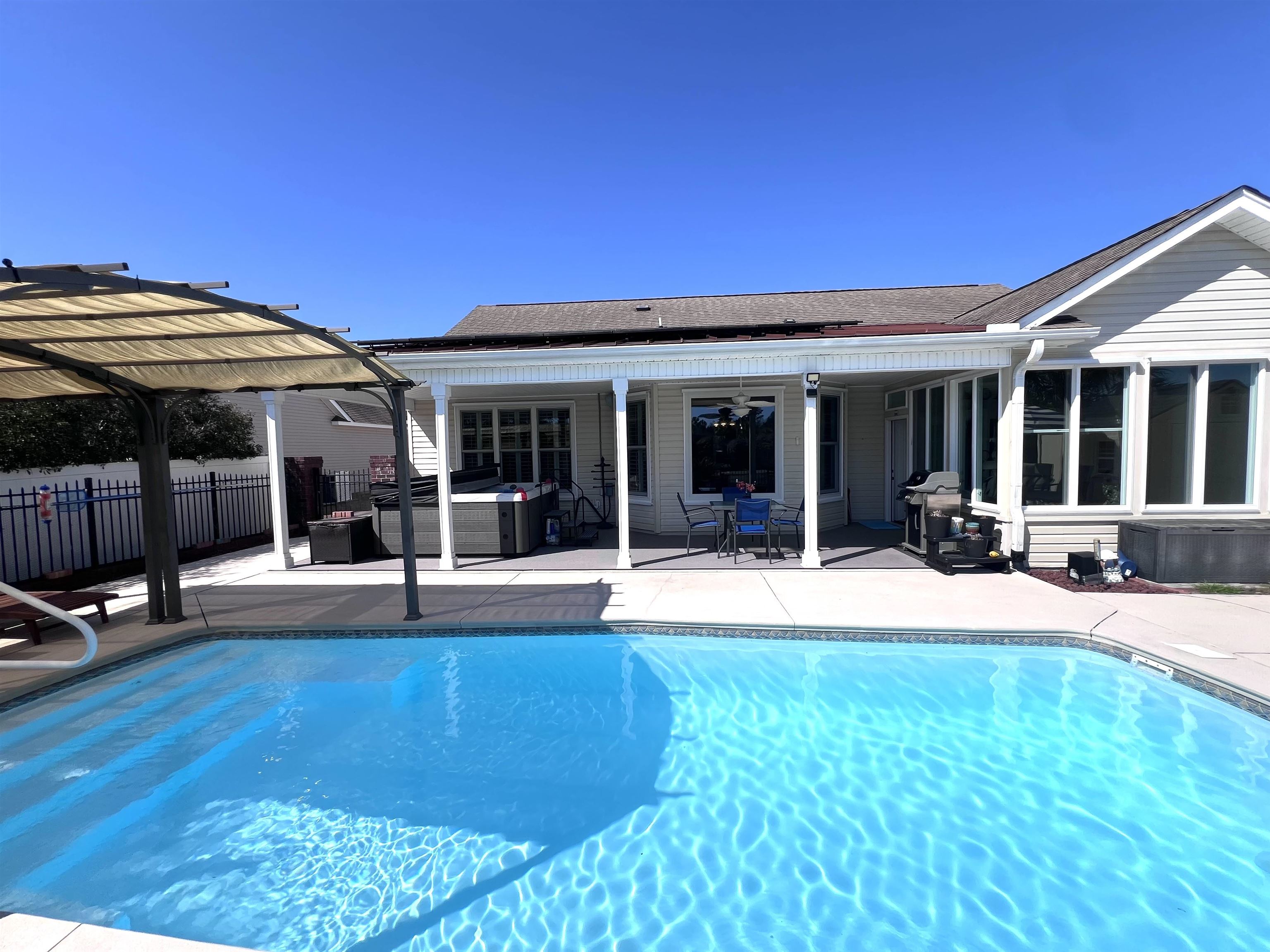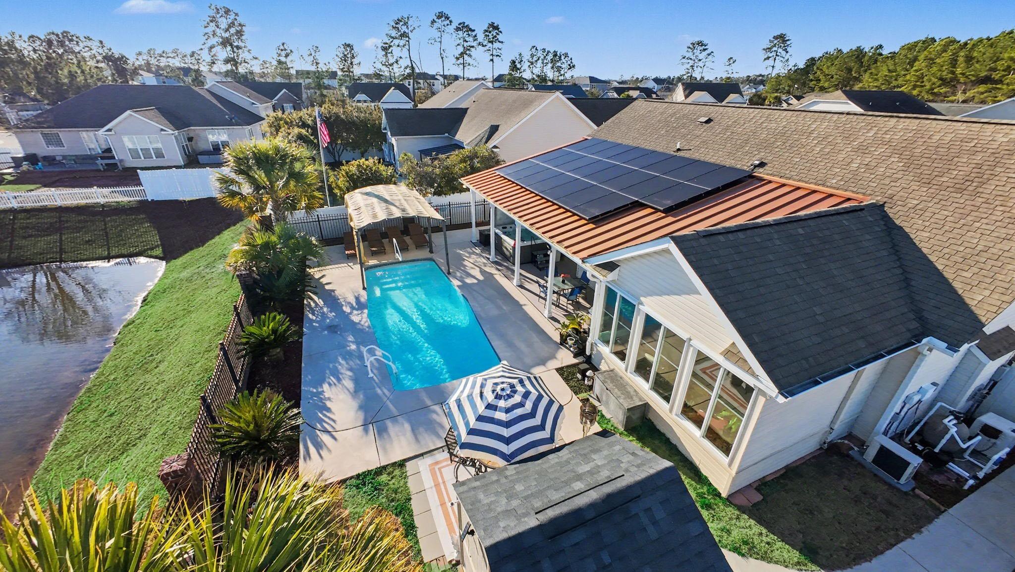 OPEN HOUSE SATURDAY MARCH 21ST 12:00-2:00 Resort-Style Living with Heated Private Pool, Solar Power & Pond Views | Hunters Ridge Crossing Welcome to this exceptional 3BD/2BA residence in sought-after Hunters Ridge Crossing, where energy efficiency meets resort-inspired outdoor living. Designed for both comfort and cost savings, this home features 23 solar panels that power the property, exporting excess electricity back to the grid for future utility credits. High-end Andersen replacement windows further enhance efficiency and comfort throughout. A 325-gallon gas tank heats the pool and fuels the gas fireplace, with additional gas lines installed behind the stove and dryer for those who prefer gas appliances. Outdoors, the backyard transforms into a true private oasis. The fenced yard showcases an inground heated pool (chlorine or saltwater) overlooking a serene pond with fountain, complemented by expanded pool decking, a shaded pergola, side-yard access, and an impressive 329-square-foot covered porch with a striking copper roof and 6-person hot tub. Inside, the living room features vaulted ceilings, rich wood flooring, and a gas fireplace, creating a warm and inviting gathering space. The chefs kitchen offers 42-inch oak cabinetry, granite countertops, stainless steel appliances, an externally vented stainless steel range hood, pantry, and breakfast bar, flowing seamlessly into a sun-filled dining nook with a picture window and plantation shutters. The first-floor primary suite serves as a private retreat with tray ceilings and a custom walk-in closet. The spa-inspired ensuite bath includes a jetted soaking tub, tiled shower with upgraded glass door, dual granite vanities, and upgraded fixtures. Guest bedrooms feature upgraded flooring, and the guest bath offers granite countertops and a tiled shower with glass enclosure. A fully enclosed sunroom with Pella windows, tile flooring, shades, and its own mini-split system extends living space year-round. Additional upgrades include HVAC (2020) with UV light and surge protection, hurricane shutters, blown-in cellulose insulation, irrigation system, palm landscaping, 8x8 storage shed, and a 2-car garage with pull-down attic storage. Meticulously maintained and just minutes from Myrtle Beach shopping, dining, golf, and beaches this home delivers elevated coastal living with built-in efficiency and long-term savings.