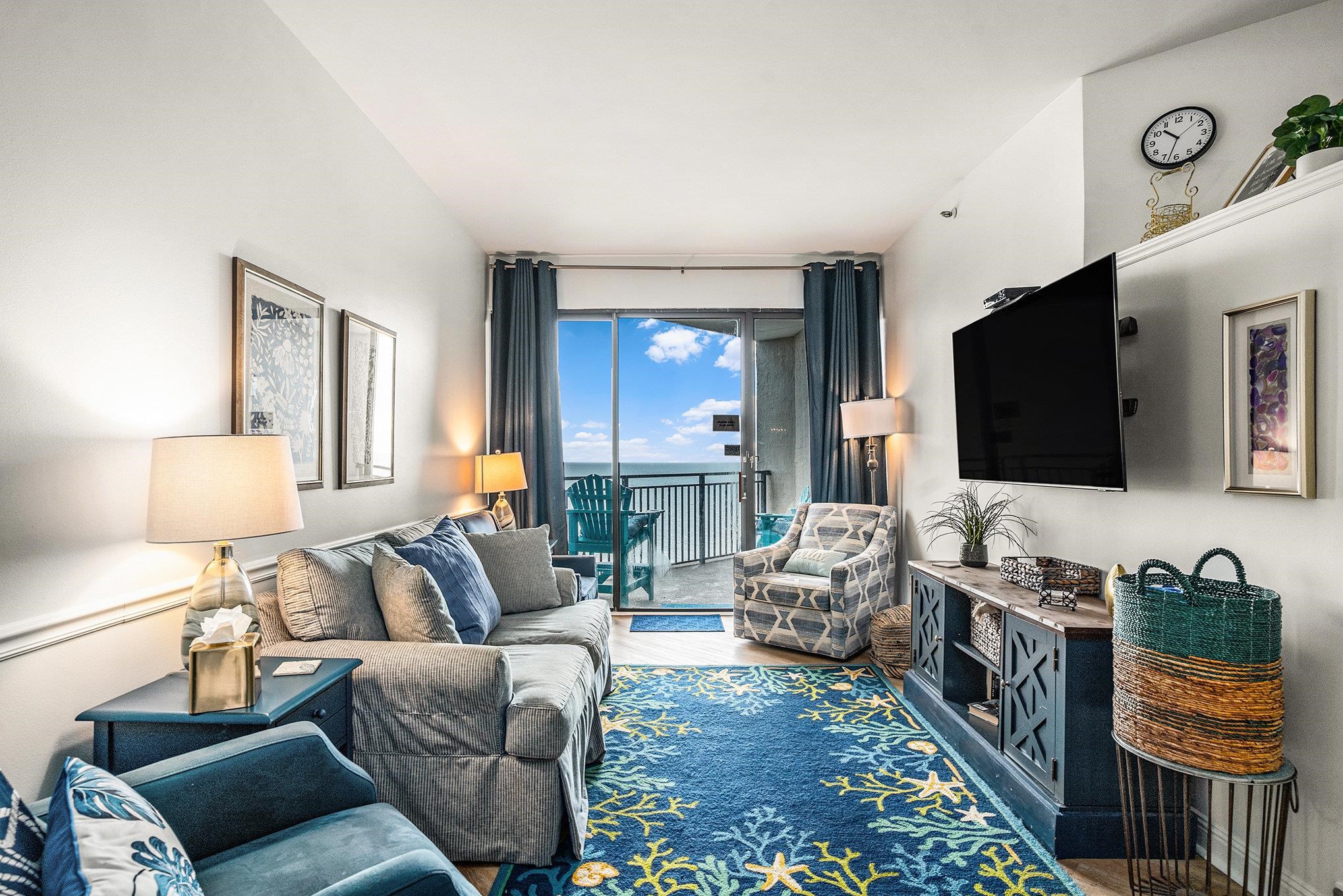 Experience the height of coastal luxury in this beautifully renovated 2-bedroom, 2.5-bath, two-story penthousea RARE opportunity in the prestigious Ocean Forest Plaza, ideally located along Myrtle Beachs highly desirable Golden Mile and Cabana Section. Situated on the 22nd floor, this elegant residence offers sweeping ocean views from several rooms. The main level features an open-concept design with a modern kitchen showcasing quartz countertops, stainless steel appliances, and a spacious dining areaperfect for entertaining. The bright and airy living room opens to a private balcony, where youll enjoy serene views of the shoreline and Atlantic horizon. A custom-designed staircase leads to the upper level, where two generously sized bedrooms each have their own private bath. The primary suite is a tranquil retreat, featuring floor-to-ceiling windows that capture some of the most captivating views along the Grand Strand. The ensuite bath includes a beautifully tiled shower and an additional vanity, offering extra space for convenience and comfort. Ocean Forest Plaza offers an impressive array of resort-style amenities, including indoor and outdoor pools, a hot tub, sauna, owners lounge, fitness center, laundry facilities, and access to an oceanfront walking trail and linear exercise park just steps away. HOA fees conveniently include interior electric, water/sewer, cable, and internet. Pet-friendly for owners. Whether youre seeking a full-time residence, vacation escape, or income-producing investment, this ocean view penthouse delivers the perfect combination of comfort, location, and lifestyle. Dont miss this rare chance to own your slice of paradiseschedule your private showing today!