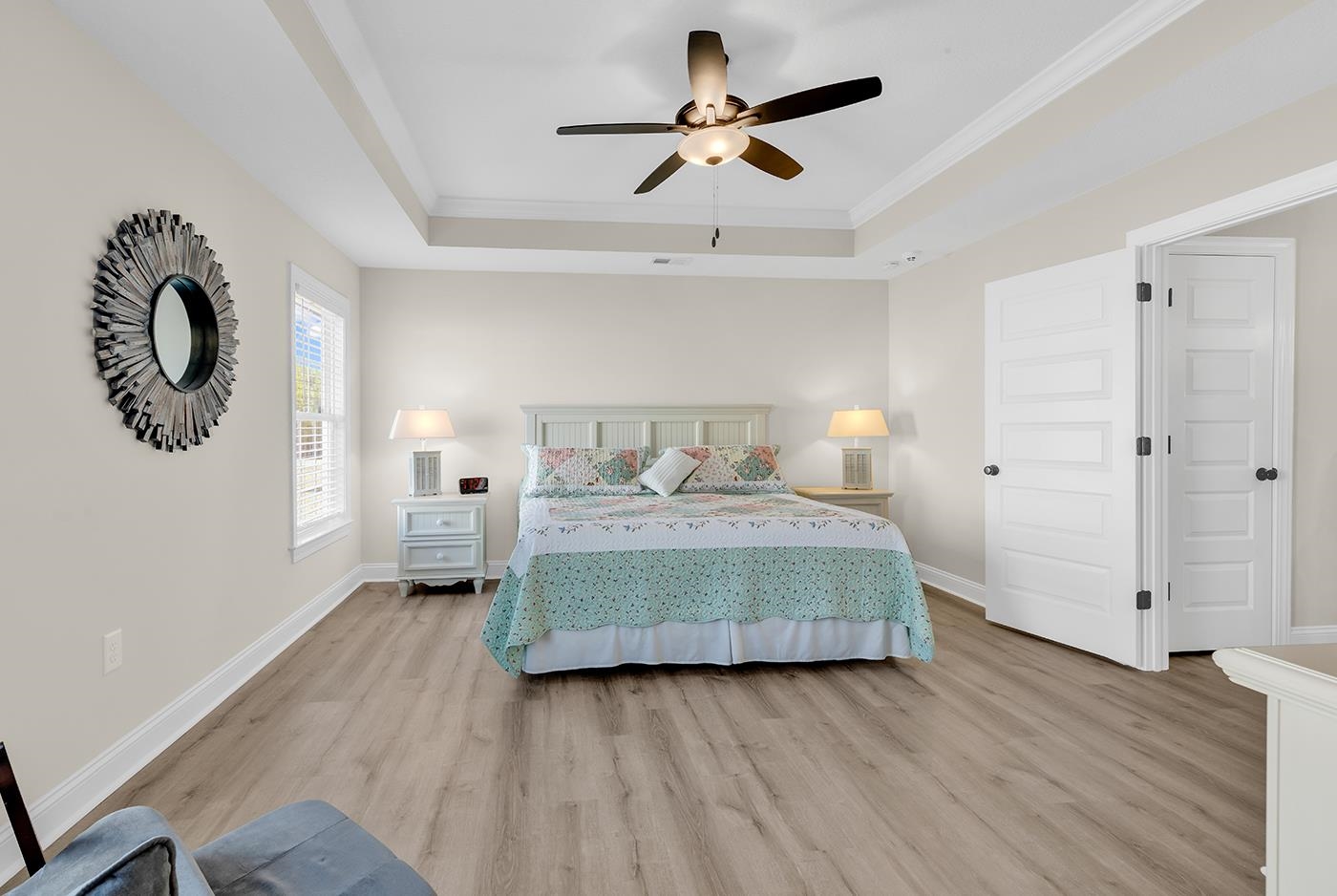PrimaryBedroom: TrayCeilings, CeilingFans, MainLevelPrimary, WalkInClosets