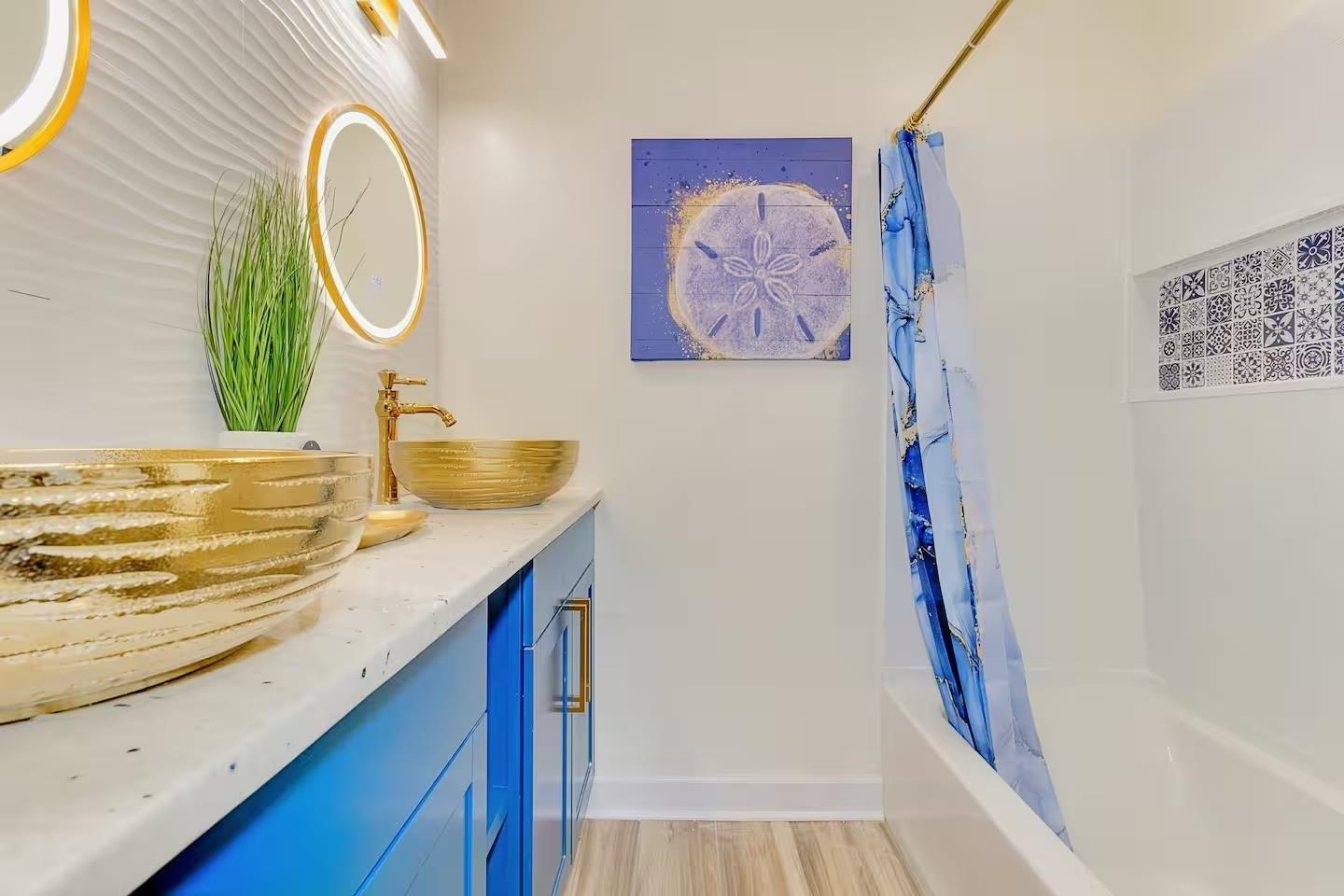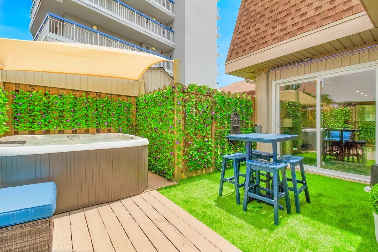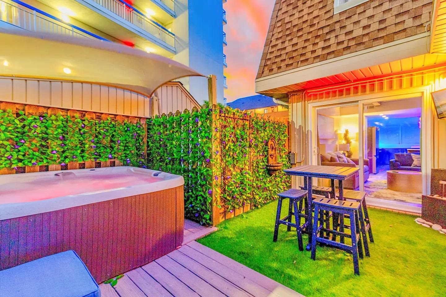 Just steps away from the best stretch of beach in the area, This beautiful newly remodeled end unit is a one of a kind with an extended large outdoor patio area. This gorgeous home is completely opened up with an amazing kitchen with extra cabinets, high end countertops , all new stainless-steel appliances with gold accents throughout the home. The half bath downstairs is fully remodeled with shiplap and gold touches. The large living room has a custom shiplap fireplace and all new furnishings. Along with being on the end, the back patio area is larger than the other 14 units. Outside you will find and outdoor kitchen, large 7-person hot tub, grass and decking , outside sitting area with tv, and even an outdoor custom enclosed shower. Upstairs you will find 2 large bedrooms with new furnishings and a beautiful updated bathroom with all gold touches making it absolutely stunning. All furnishing, TVs, and appliances are included in the sale. This is truly turn key. Can make this beautiful home your primary, second home or a short term rental or a little bit of everything. Why not.. A home like this rarely comes out on the market so will go fast. In the northern part of Myrtle Beach where you are close to everything the Grande Strand has to offer, Broadway at the Beach,Barefoot Landing, entertainment venues, shopping, Golf and great dining.